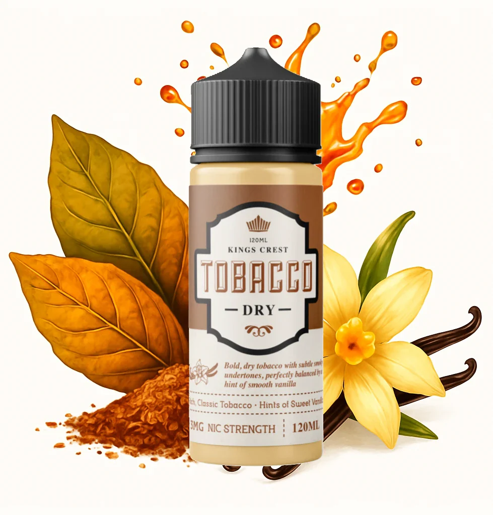 Kings Crest Tobacco Dry es un e-líquido premium de la línea Tobacco de la marca Kings Crest, diseñado para vapers que buscan una experiencia de tabaco más rica y seca, sin sacrificar la suavidad sutil de un toque dessert. Este blend refinado lidera con un sabor audaz y terroso de tabaco seco, robusto y de cuerpo completo, que evoca la autenticidad de un tabaco maduro y sin dulzuras excesivas. Bajo la superficie, emerge una capa aterciopelada de custard de vainilla que suaviza los bordes con un toque de dulzor cremoso y sutil, creando un equilibrio sofisticado entre lo seco y lo cremoso. Al inhalar, domina el tabaco seco y terroso; al exhalar, el custard de vainilla añade una nota suave y madura, con un final equilibrado que lo hace ideal para sesiones todo el día. Es una variación sofisticada del perfil clásico de tabaco, perfecta para exfumadores o amantes del tabaco que desean un vapeo premium y discreto. Disponible en versión freebase para dispositivos de wattage medio-alto y en salt nic para pods de baja potencia, produce un vapor denso y aromático.
